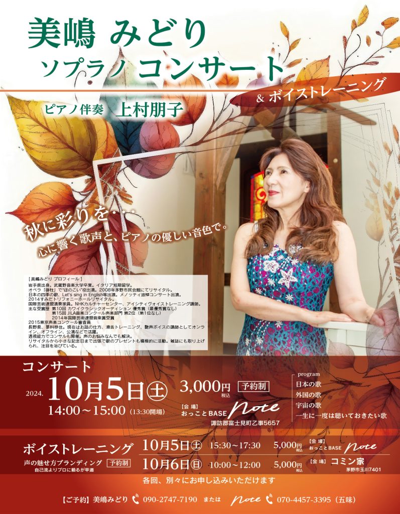 10月5日土曜日 蓼科在住の声楽家、美嶋みどりさんとピアニストの上村朋子さんによるコンサートです。美嶋さんの美しく艶のある歌声がホールに広がります。きっと迫力いっぱい!秋、音楽と共に素敵な一時を。お申し込みはnote電話 07044573395 でも受付て... -