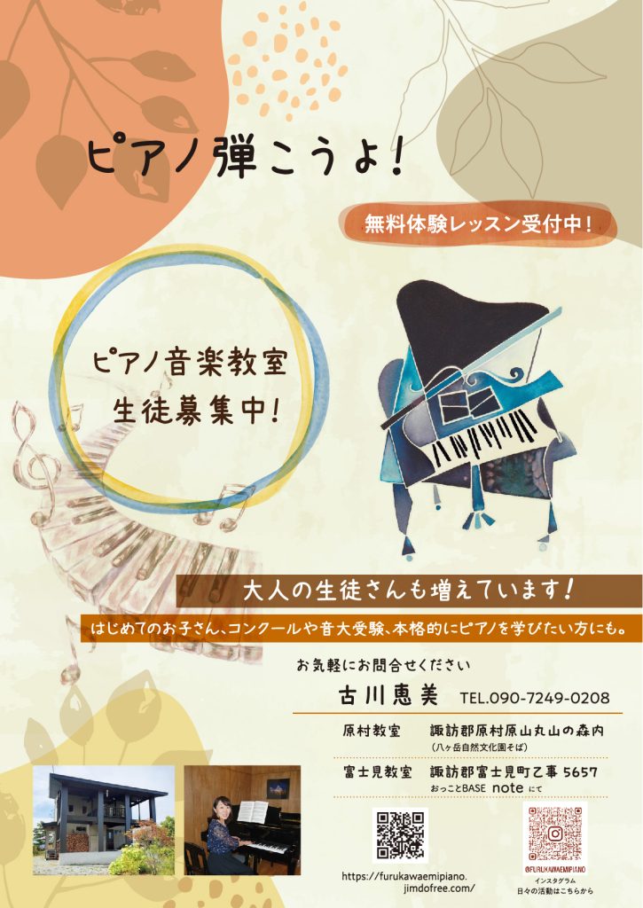 原村の古川先生の出張ピアノ教室もnoteでやっています。生徒さんは幼児から大人50代(私も含め)もっと上の先輩方まで様々です♪私も毎回楽しく教えていただいています(^^)音色や響き、音楽性をグッと掘り下げて、その曲の魅力を引き出してくださいます。いつ... -