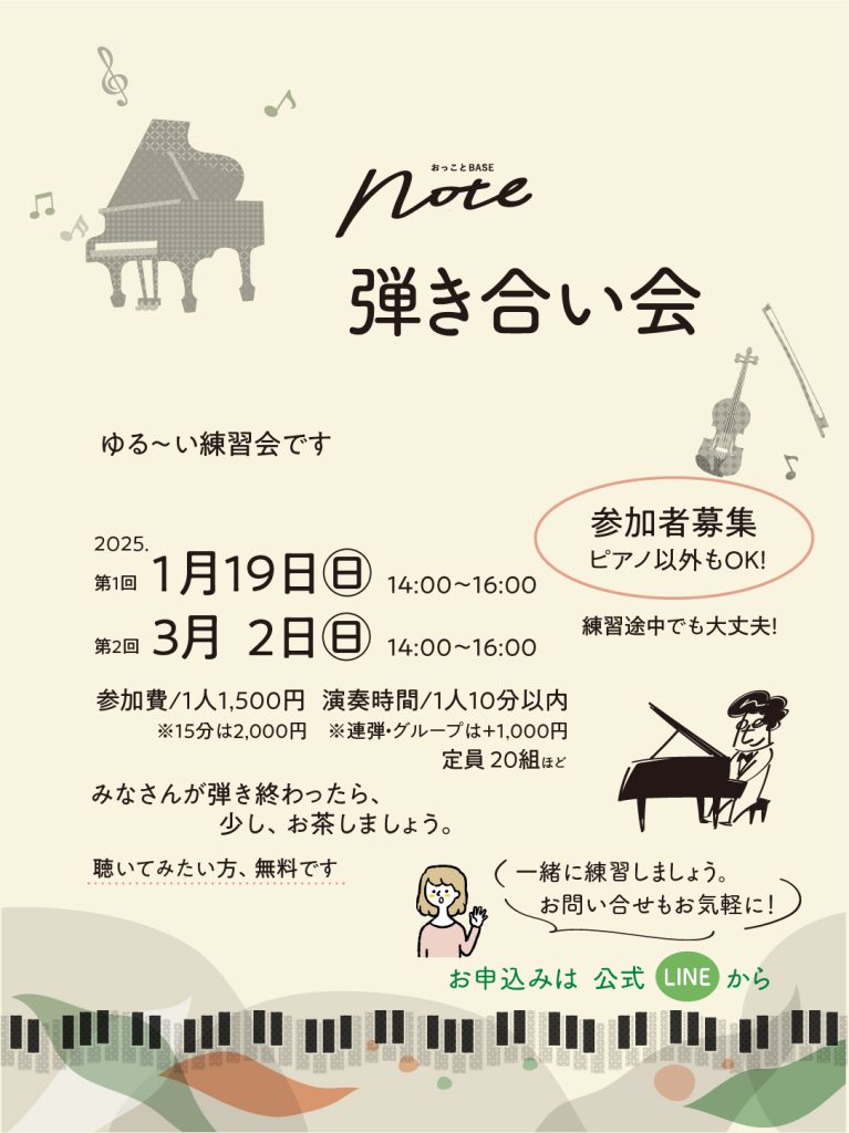せっかくグランドピアノがあり、椅子も沢山あるので、noteで弾き合い会を企画しました♪第1回 1月19日(日) と 第2回 3月2日(日) 14:00〜16:00 お子さんから大人まで、どなたでも音楽が好きな方にお越しいただき演奏して頂ければ幸いです♪... -